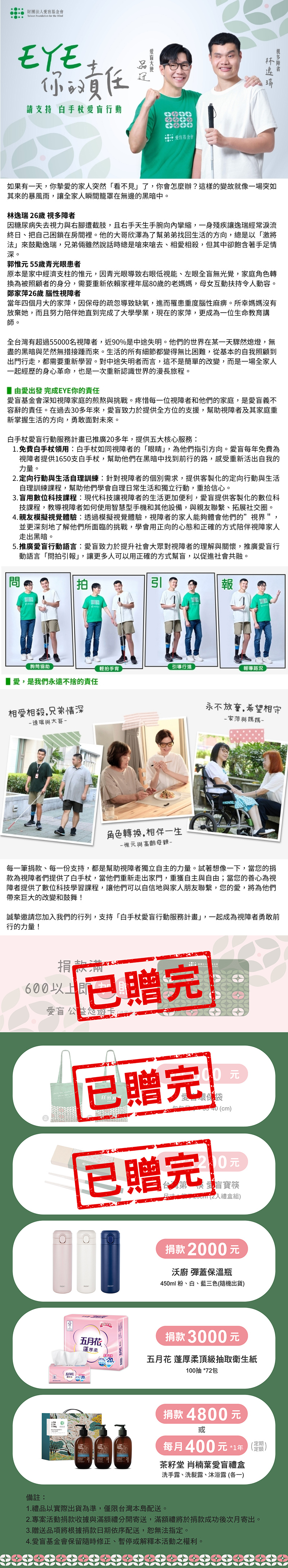 ❤️注意事項❤️ 1. 捐款收據:由愛盲基金會完成開立,並在捐款完成後約14個工作天內寄出給捐款人。 2. 欲索取回饋禮品請選紙本收據並填寫寄送地址,禮品將於隔月寄發。 3. 如有捐贈相關疑問,請於週一至週五電洽:02-7725-8000#8202、8203、8205,專員將儘速為您解答。 4. 愛盲基金會有隨時及最終保留、變更、終止或取消一部或全部本活動之權利與本活動注意事項最終解釋權。