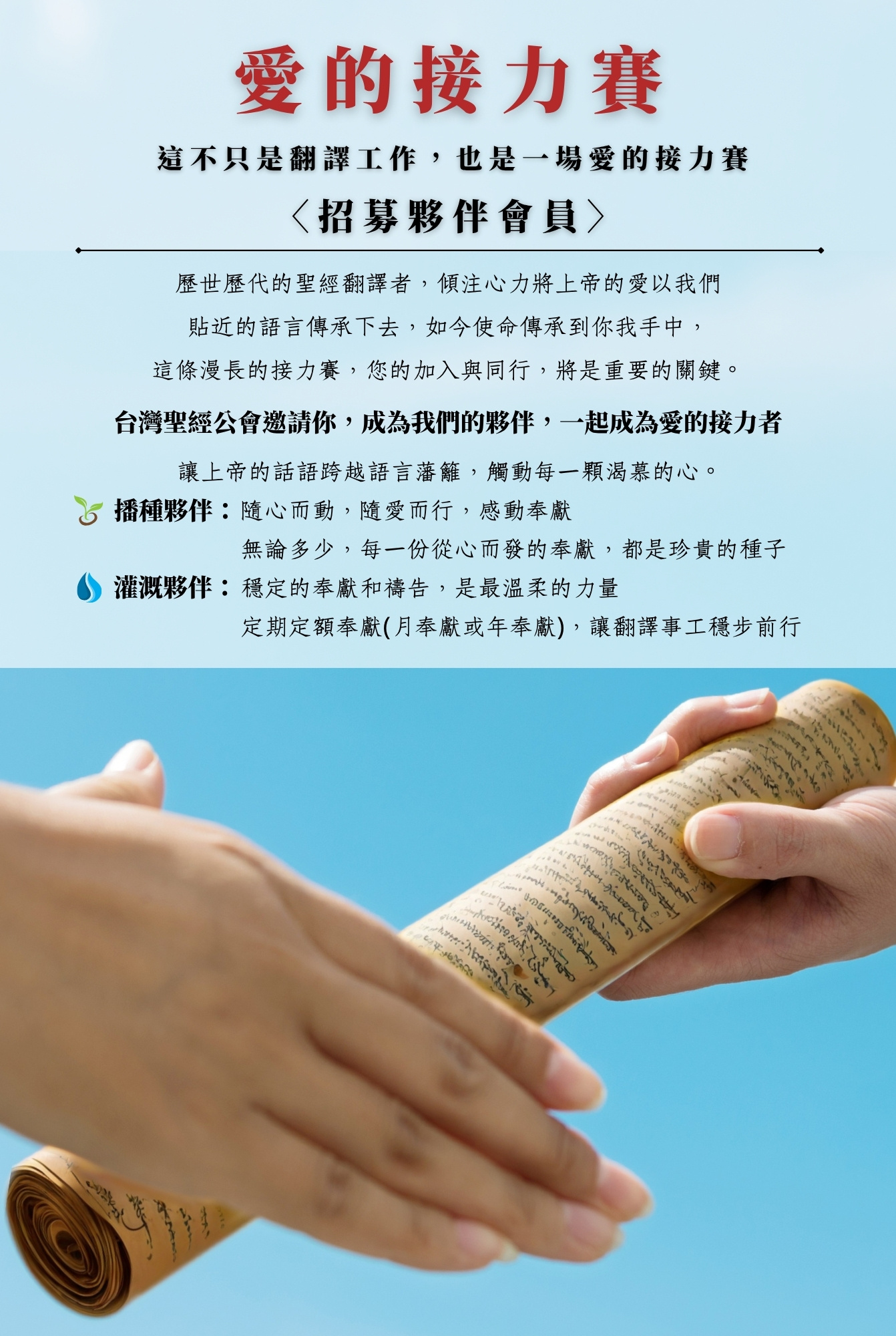 台灣聖經公會誠邀教會與個人成為事工夥伴,齊心支持這場愛的翻譯接力賽,讓聖經觸動人心。
